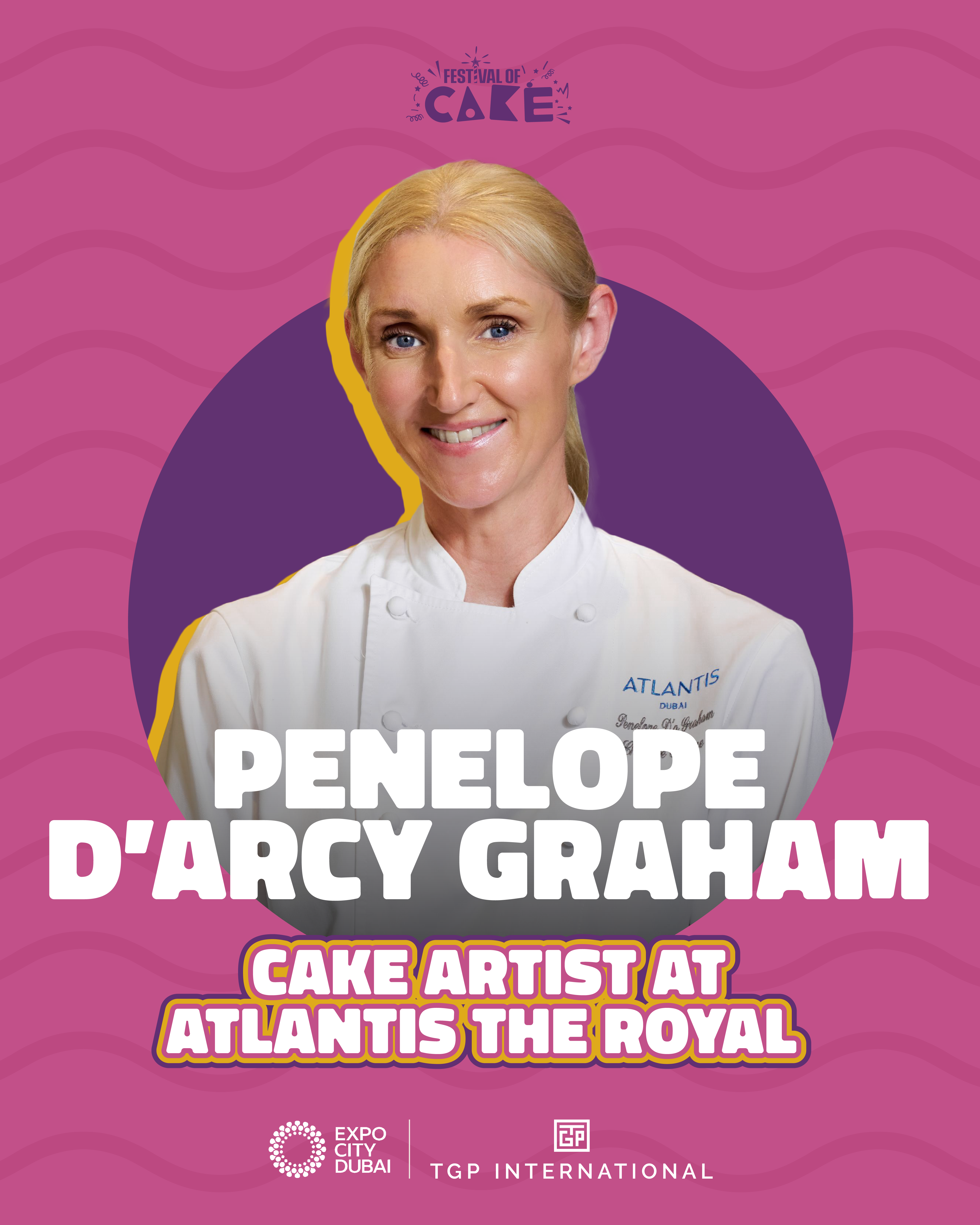 Penelope d'Arcy Graham, renowned cake artist at Atlantis The Royal, boasts 20+ years in bespoke cake design. Recognized as Wedding Cake Designer of the Year 2025, she teaches worldwide, inspires thousands, and is celebrated for her artistry, innovation, and sugar flowers.
